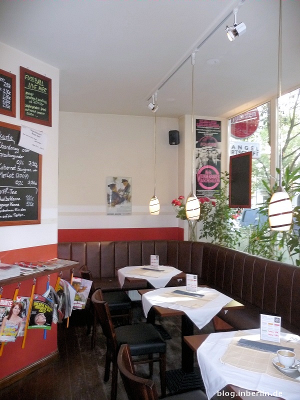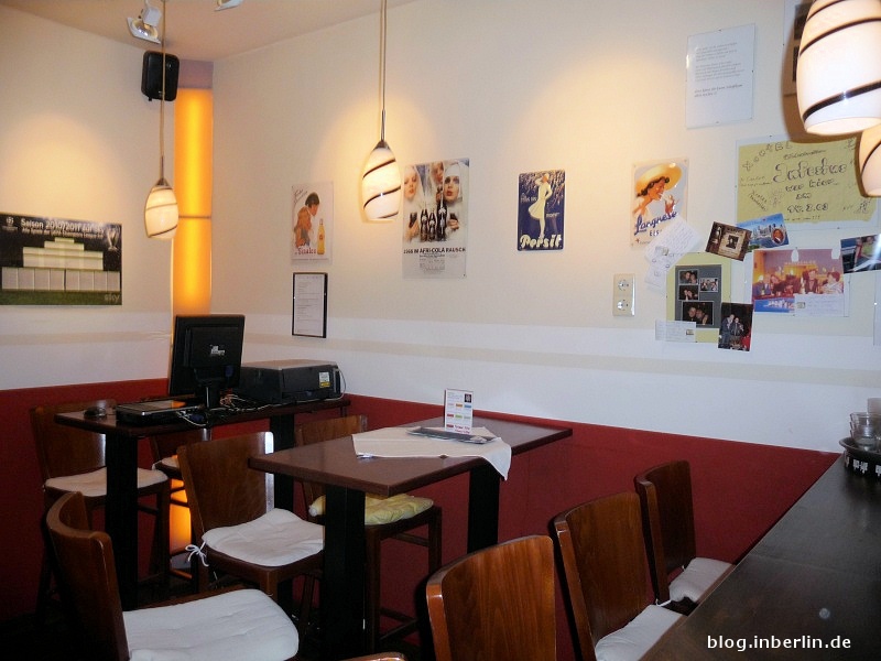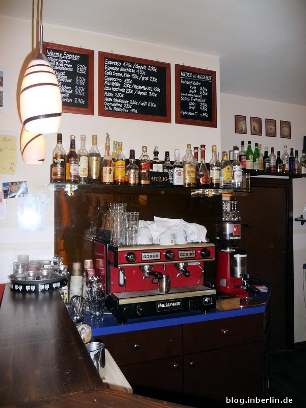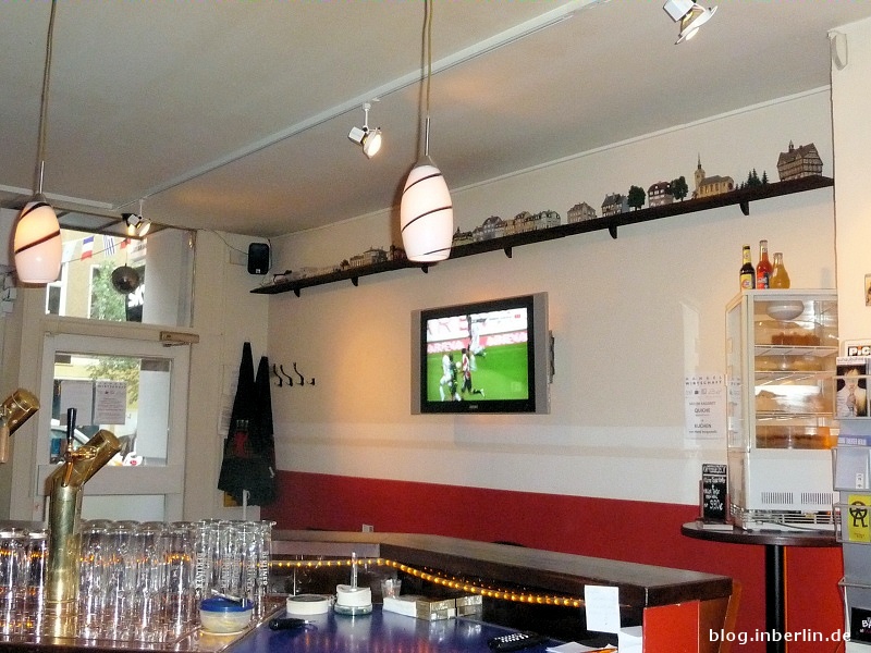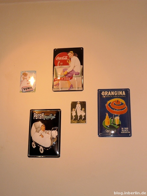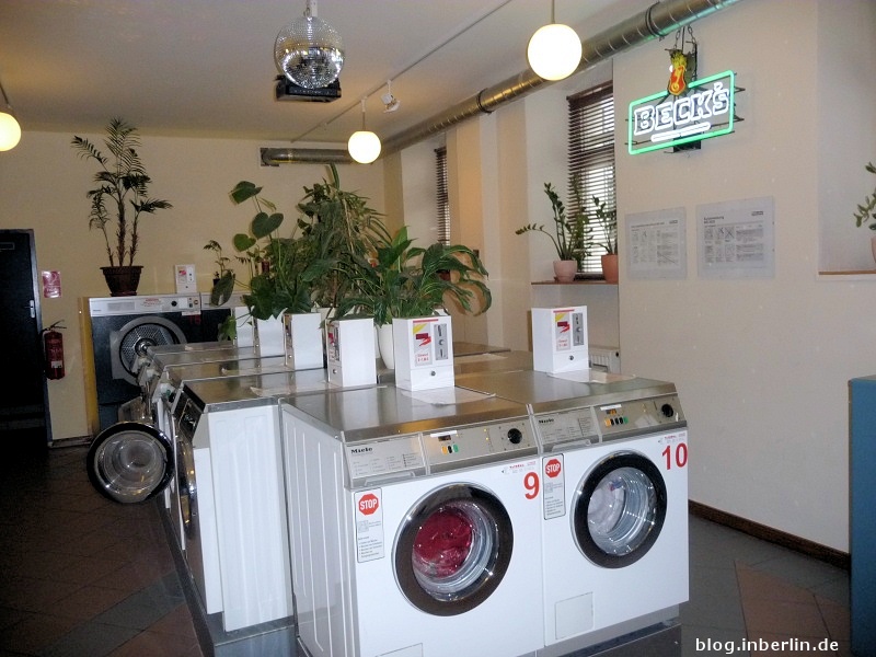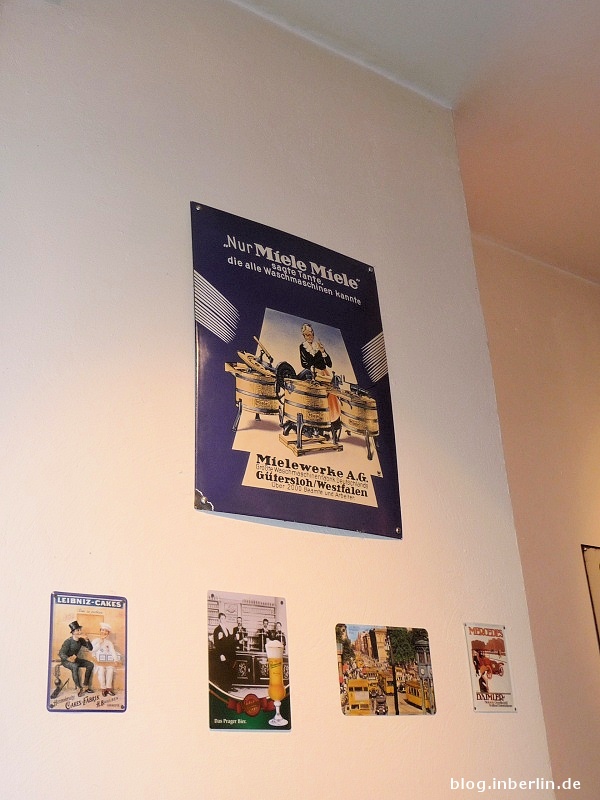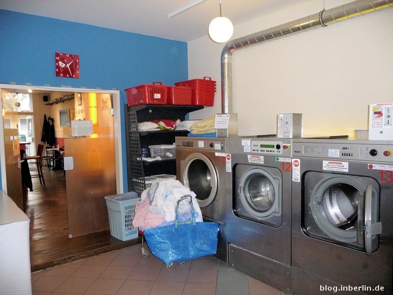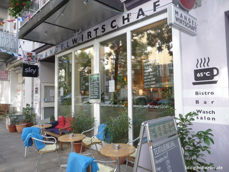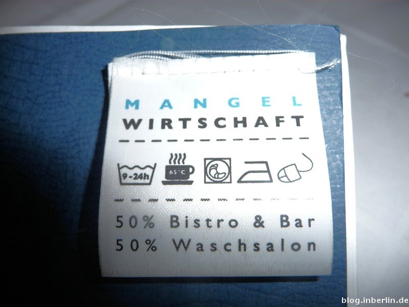 Im nordischen Viertel im Prenzlauer Berg, genauergesagt in der Paul-Robeson-Str. 42 (siehe auch Fußnote) befindet sich die Lokalität Mangelwirtschaft. Der Name verrät schon einiges, irgendwie muss es was mit Wäsche zu tun haben und noch im Zusammenhang mit einer Wirtschaft. Auf den ersten Blick von außen stehen wie woanders auch, Tische und Stühle auf dem Gehweg. Beim Hineingehen springen einem angenehme Sitzmöglichkeiten, der große Tresen und Fernsehbildschirme ins Auge. Auf dem zweiten Blick erblicken die Augen weiteres, Blechschilder an den Wänden, eine Art Kuchenkühlschrank (durchsichtig) mit Inhalt, ein Regal mit Modelleisenbahnhäuser, ein Internetrechner, sowie dass es hinten eine milchfarbene Tür gibt, wo die heiligen Waschgeräte stehen. Dahinter liegen für das dritte Auge sichtbar, die Toiletten, bei denen U-Bahnansagen zu hören sind.