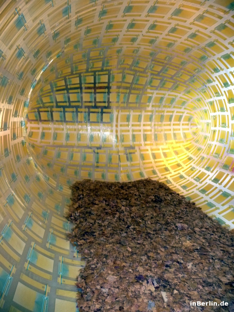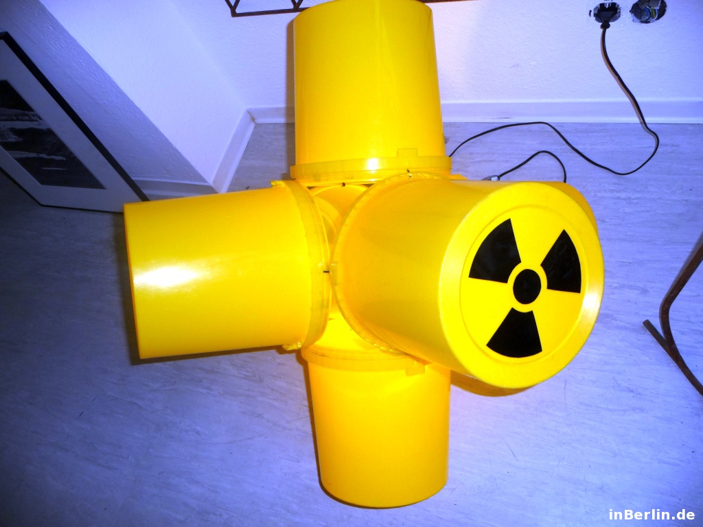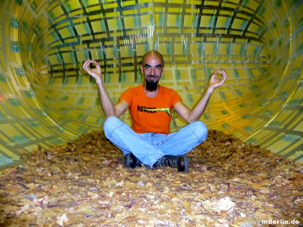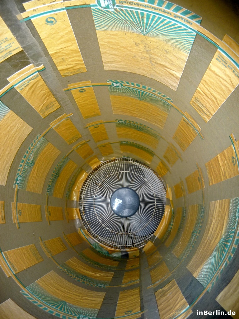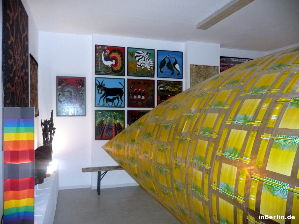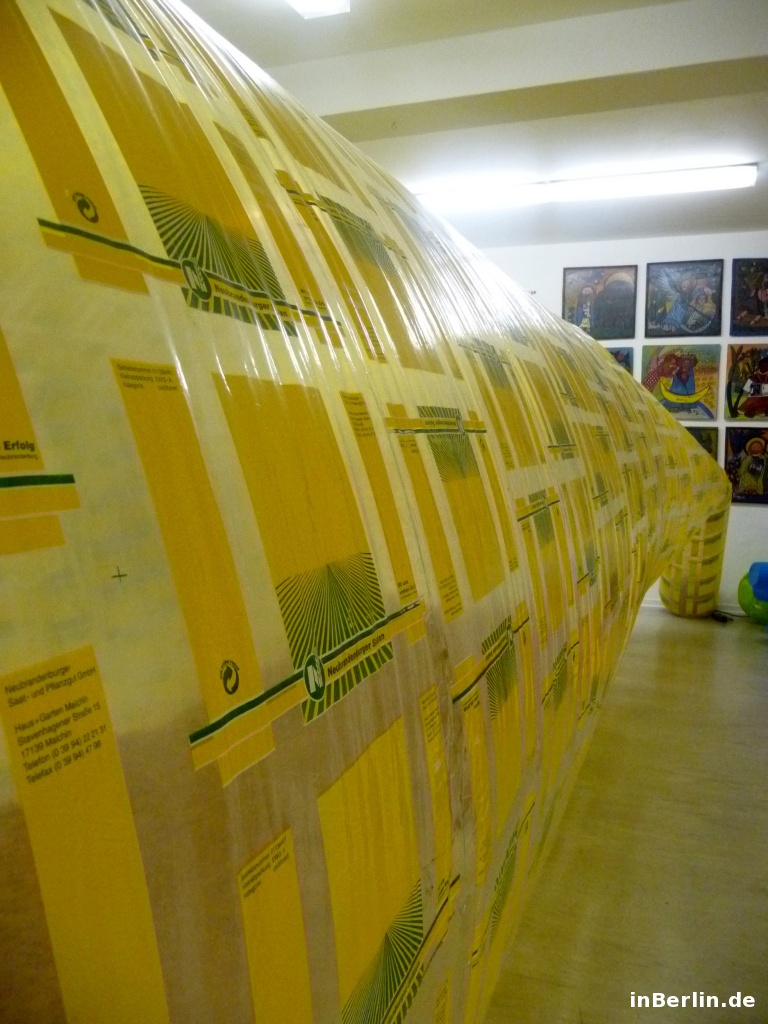 Kurator ist der sympathische Alfredo Sciuto, ein italienischer Künstler aus Italien / Sizilien. Schwerpunkt sein Kunsttätigkeit lieg im Fantasy-Bereich und in der Wiederverwendung von Gebrauchsgütern. Im Jahre 2001 kam er nach Berlin und fühlte sich gleich heimisch. Unter anderem lernte er die Lohmühlen Wagenburg und Kunstszene kennen, welche er heute noch begleitet. Neben ein paar Berliner Kunstprojekten gab es 2006 auch wieder ein Projekt in Sizilien, dort kam er mit dem zweiten Gotland-Kurator zusammen. Gemeinsam entschieden sie sich, einen Gewerbebereich in Berlin für Kunst zu erwerben. Und so wurde es die Gotlandstr. 5. Ein paar Werke von Alfredo Sciuto sind die aufblasbaren Objekte in Form von Riesensäcken /-würfel sowie arrangierte Eimer in Form eines Igels. Zum Zeitpunkt des Interviews und Besuches war ein großer aufblasbarer Luft-Sack zu sehen und konnte auch betreten werden! Dies lässt sich visuell am besten in der Bildergalerie veranschaulichen.