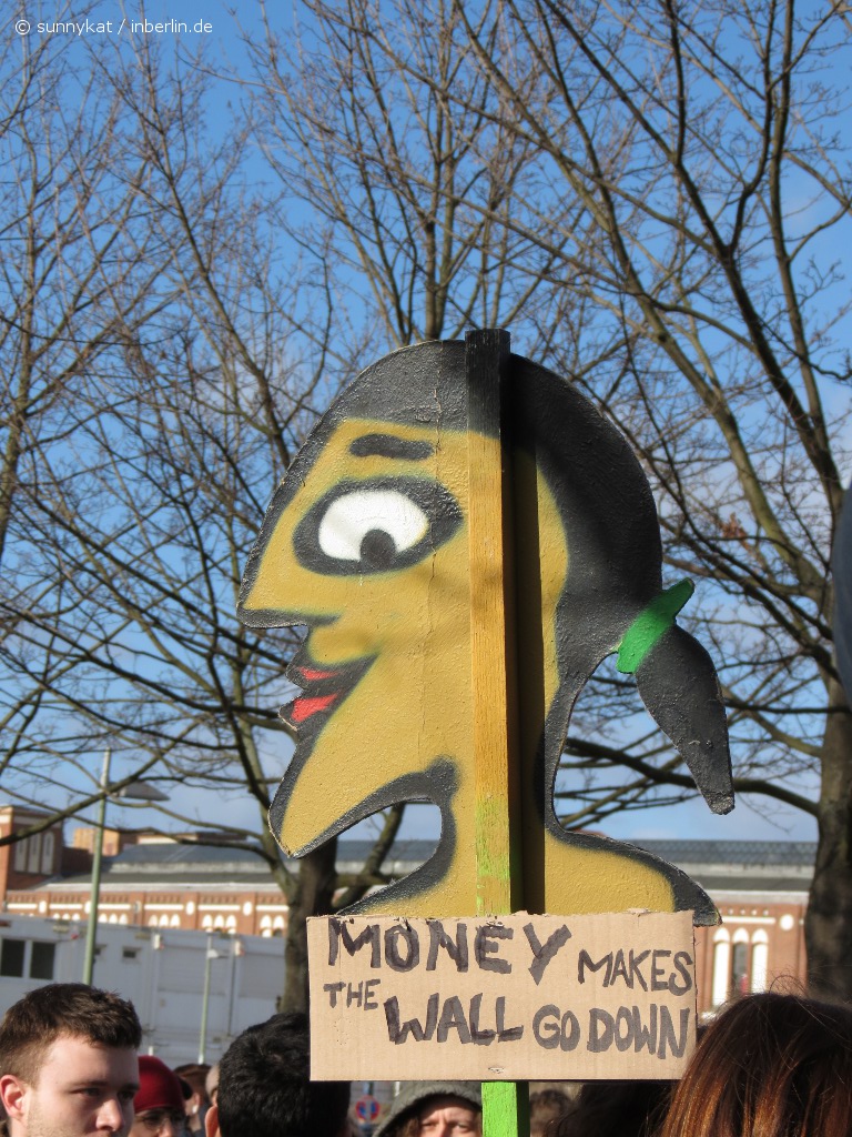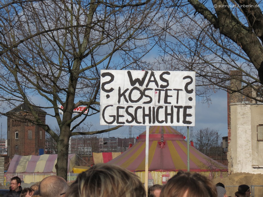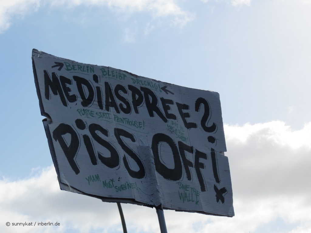Freitag fand eine spontane erste Demo statt, so konnte zunächst ein Baustopp erreicht werden, nachdem schon ein Teil der Mauer entfernt wurde. Am Sonntag wurde dann zu einer weiteren Demo aufgerufen, zu der ab ca. 14 Uhr zahlreiche Menschen erschienen – nach Polizeiangaben etwa 6.000. Viele selbstgemachte Plakate waren zu sehen („Berlin verkauft sich und seine Geschichte“…) und immer wieder erscholl der Schlachtruf: „Wowereit, die Mauer bleibt“. Die Redner forderten ein Eingreifen des Berliner Senats, z.B. ein Angebot eines alternativen Grundstücks fürs die Investoren des Bauvorhabens. Eine kleine Galerie mit Fotos von Sonntag findet ihr am Ende des Artikels.