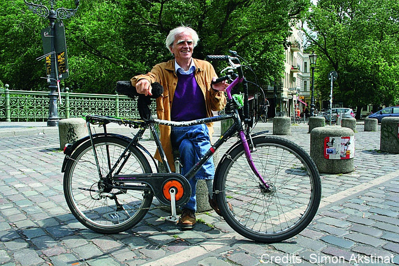 Ein interessantes Porträt ist das vom dänischen Botschafter Poulsen-Hansen, der sich nicht nehmen lässt – klar zu stellen – dass Kopenhagen, in Sache Infrastruktur und Fahrradfreundlichkeit bereits das gute alte Amsterdam abgelöst habe. Man nehme sogar hin, dass Kopenhagen jetzt das Problem des Fahrradstaus habe. Das besondere Merkmal an seinem Rad neben dem dänischen Rot versteht sich, ist die Beschriftung „Kgl. Dänische Botschaft“, was sicherlich immer freie Fahrt garantiert und Diebe auf Abstand hält. Auch der Ur-Grüne Hans-Christian Ströbele hat sein Rad als Lebensbegleiter. Aus guter Quelle weiß ich, dass während er auf Demos gekonnt die Volksnähe praktiziert, immer ein „Grüner“ vom Kreisverband auf sein Rad aufpassen muss. Gefragt, wie er dem berühmten Grünen überzeugen konnte beim Buchprojekt mitzumachen antwortete Simon selbstbewusst: „Bei einem solchen Projekt, gehört er dazu. Er musste dabei sein.“ Darauf hin unterlasse ich das Nachfragen, denn wie Helmut Kohl immer zu sagen pflegte: „Was zählt, ist was zum Schluss rauskommt.“