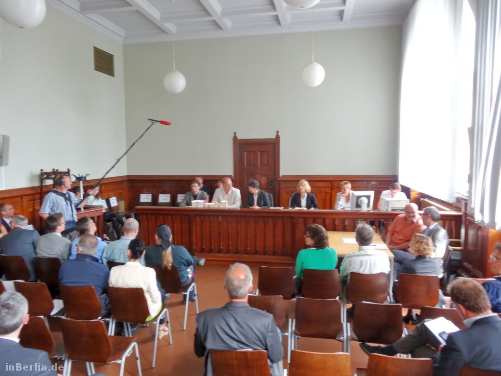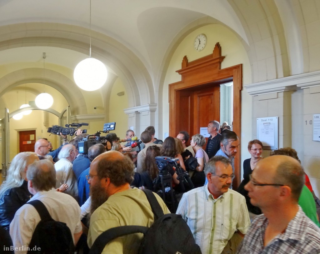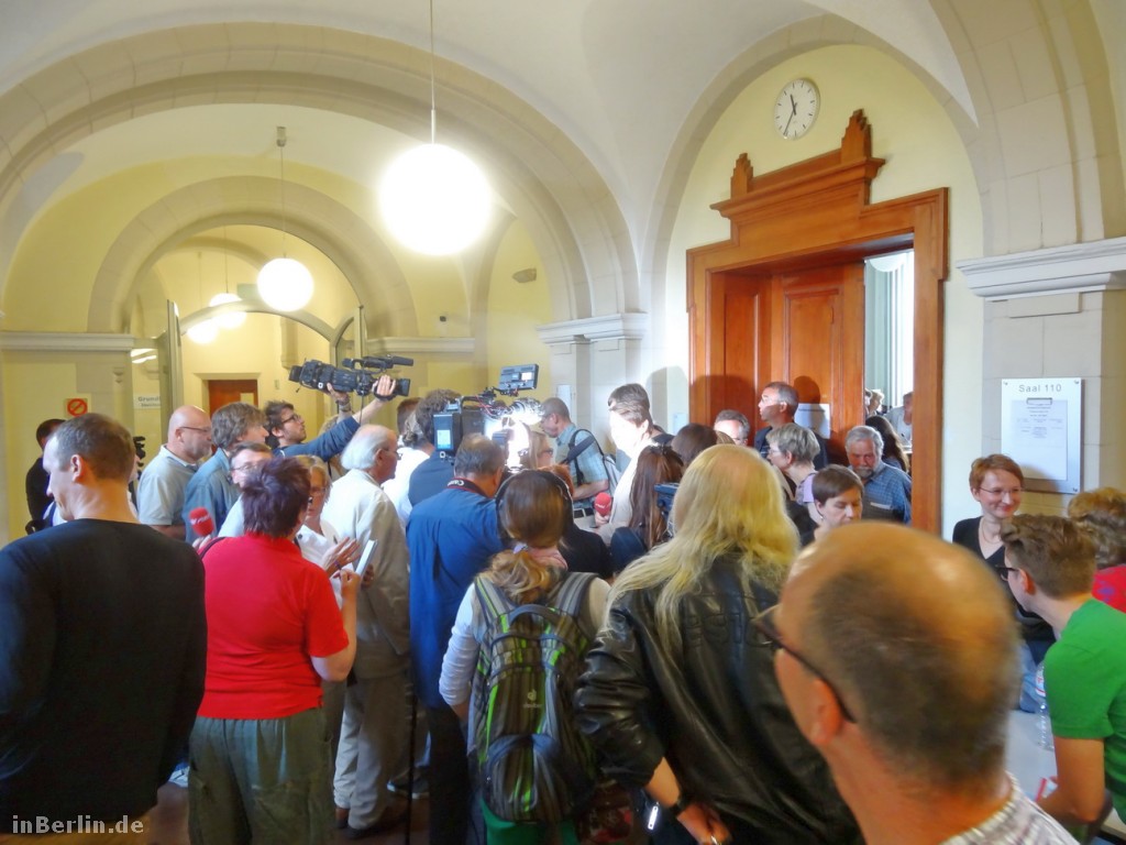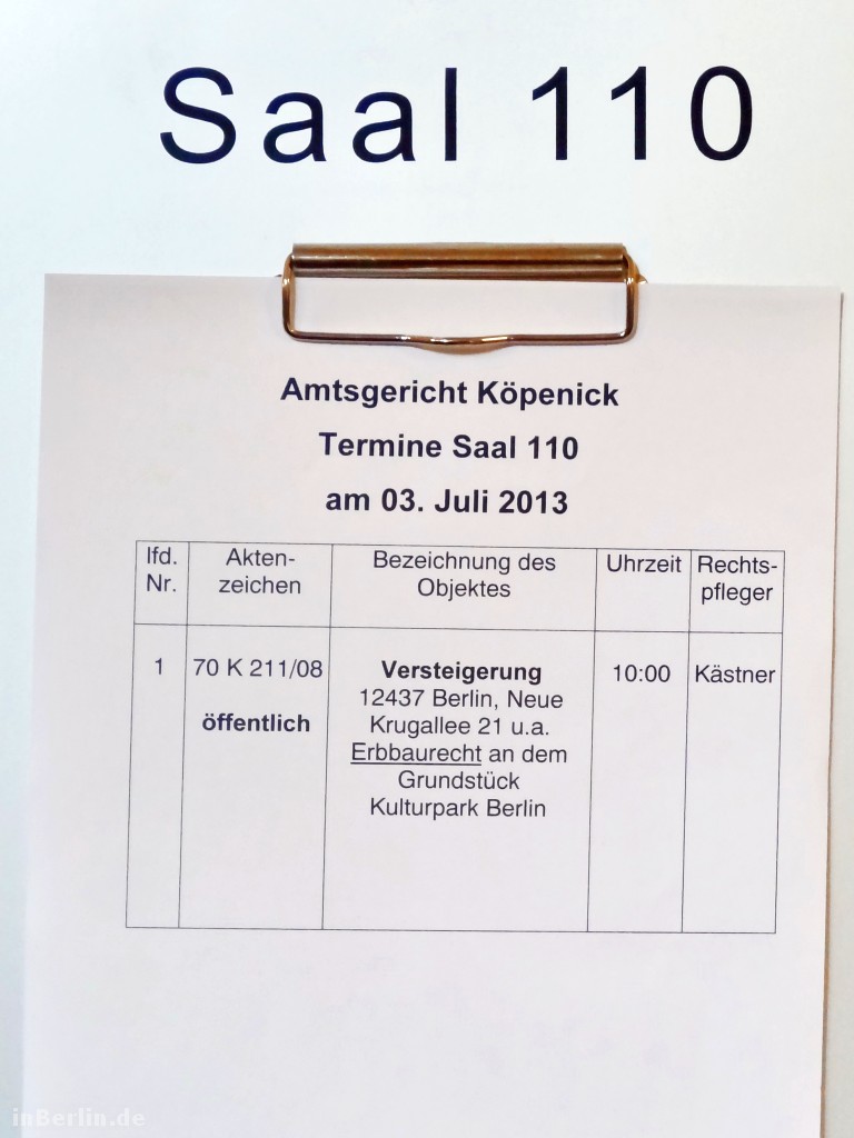 Heute 10.00 Uhr Amtsgericht Treptow-Köpenick, ganz Berlin war gespannt auf diesen Termin, der Andrang war natürlich wie erwartet groß. Die Sicherheitskontrollen aber auch, Kontrollen in den Taschen und am Körper bei Jedermann und Jederfrau waren erst mal angesagt, insgesamt konnten dann etwa nur 100 Zuschauer und Presseleute im Saal sein. Die Richterin las als erstes formal alles vor, offiziell begann danach um 10.29 Uhr das Bieterverfahren. Die Spannung stieg gewaltig, wer als erstes ein Gebot abgeben würde. Ein 15 Minuten ungeduldiges Warten begann, bis die landeseigene Liegenschaftsfonds Projektgesellschaft mbH & Co. KG das erste Gebot mit 820.000 € abgab, das zweite Gebot kam, von der erst am 24.06.2013 gegründeten, SP Kultur und Freizeit GmbH Berlin mit 1.123.000 € sofort danach.