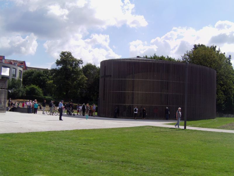 Am gestrigen Tage (13.08.13) fand die offizielle Gedenkveranstaltung an der Versöhnungskapelle statt, dort wo bis 1985 die Versöhnungskirche stand. Den DDR-Machthabern war ihre Symbolik ein Dorn im Auge: Die Versöhnungskirche mitten auf dem Todesstreifen und so nah an der Grenze, das war den Machhabern nicht geheuer. So wurde die Kirche 1985 schliesslich gesprengt (hier das Video dazu) und somit der Dialogpolitik zwischen Ost- und Westberlin eine deutliche Absage erteilt. In der heutigen sehr kleinen Kapelle hat man einen Blick auf die gesamte Fläche der Bernauer Str. und steht richtig im Zug der Windbewegung. Unabhängig von der persönlichen Glaubensfrage ist ein Besuch der im Jahr 2000 eröffneten Kapelle sehr beeindruckend und allemal empfehlenswert.