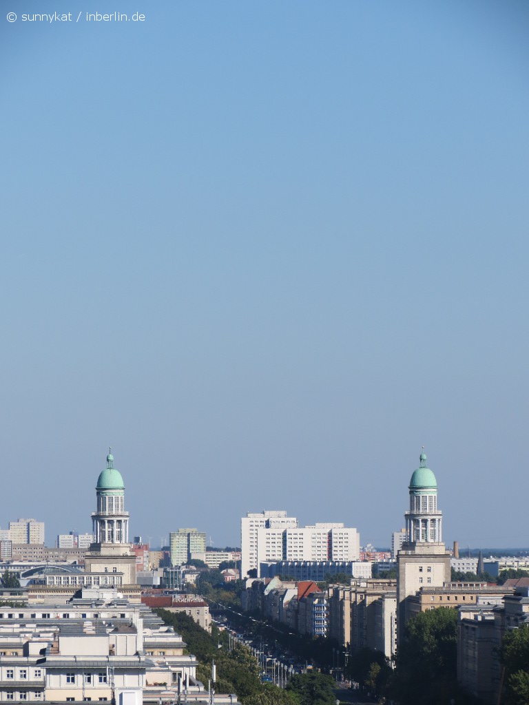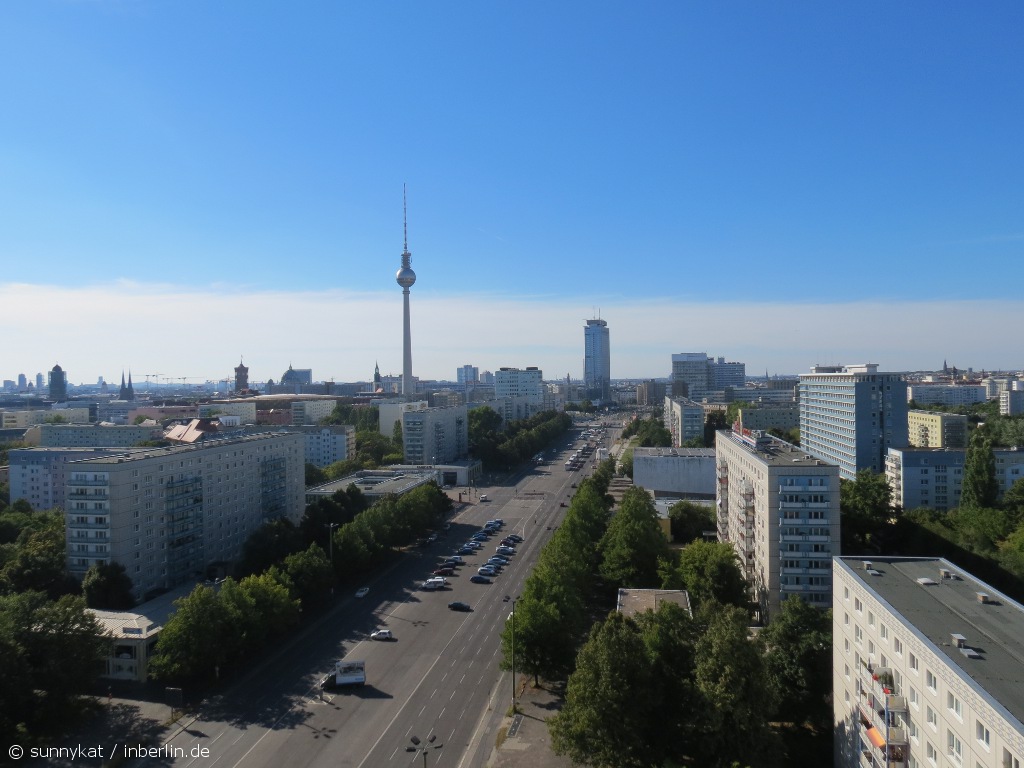 Am Westausgang des Strausberger Platzes befinden sich zwei 14-geschossige Hochhäuser: mit Blick Richtung Alex links das Haus des Kindes und rechts das Haus Berlin, die in den 50er gebaut wurden.