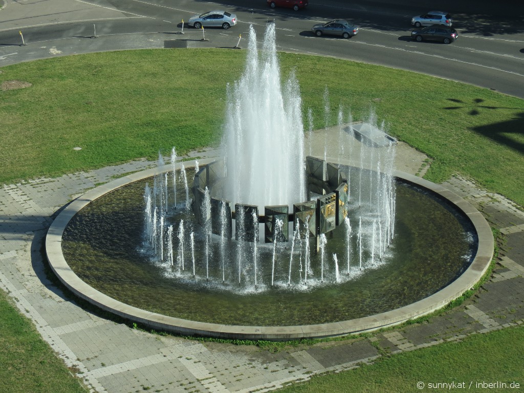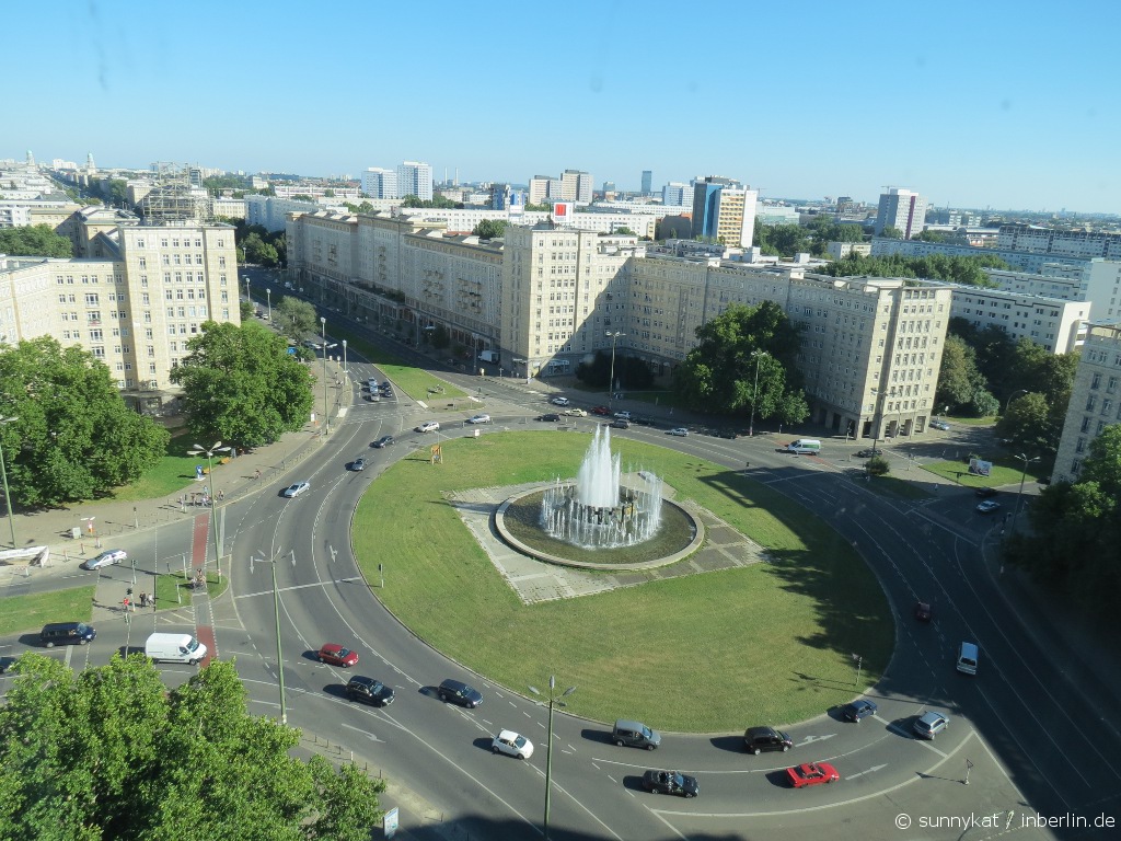 Das Haus Berlin liegt am Strausberger Platz an der Karl-Marx-Allee. Im Zweiten Weltkrieg wurde diese Gegend nahezu vollständig zerstört. Zu Zeiten der DDR war der Aufbau der früher sog. Stalinallee ein Prestigeobjekt. Hier wurden allerhand sozialistische Wohnhäuser gebaut (siehe auch unser Artikel vom Frankfurter Tor). Die Bebauung um den Strausberger Platz herum wurde von dem Architekten Hermann Henselmann verantwortet. Der mittig stehende Brunnen von Fritz Kühn wurde 1966 aufgestellt, die Wasserfontäne steigt 18m hoch.