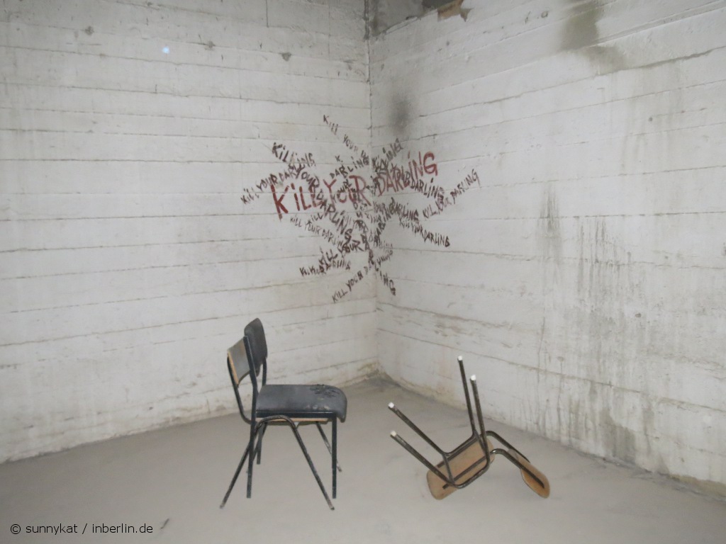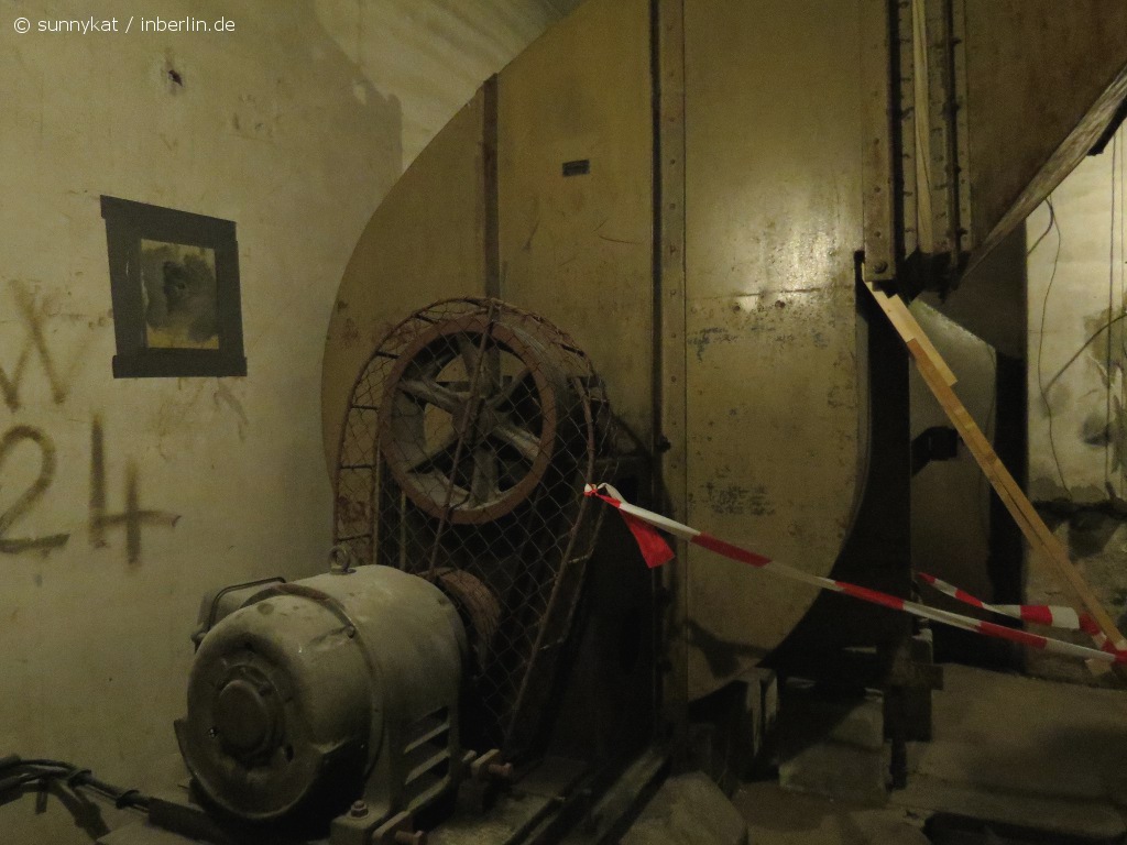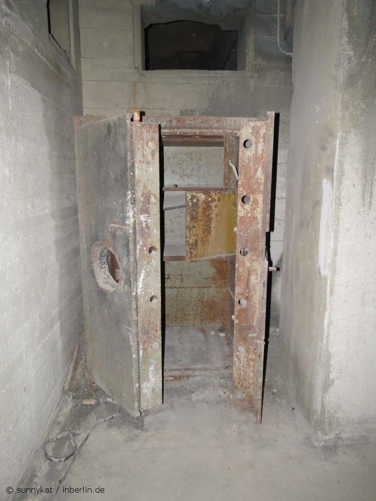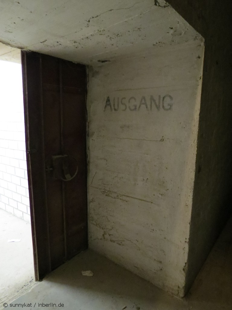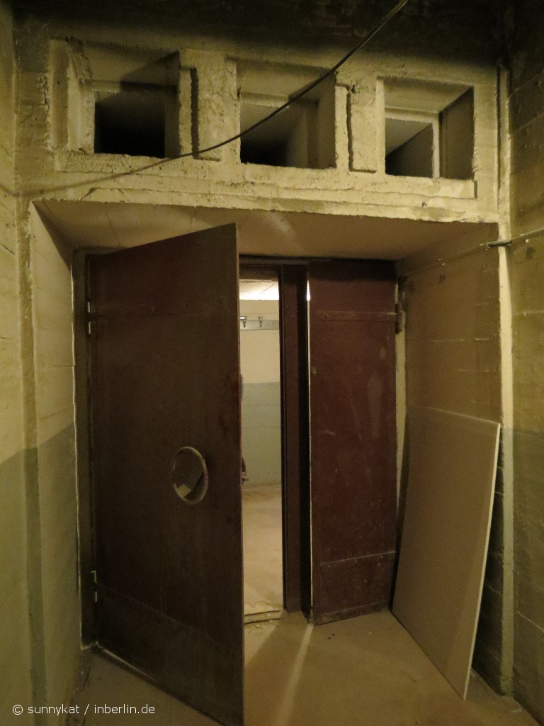 Aber zurück zum Bunker. Dieser entstand in den 1930er Jahren zunächst als klassischer Luftschutzkeller, zuerst unter der Bernhard-Weiß-Straße (früher Otto-Braun-Straße). Das Statistische Reichsamt lagerte hier Material und Akten und es gab einige massige Tresore. Bei Luftangriffen im Mai 1944 wurden jedoch große Teile zerstört, 26 Menschen kamen dabei ums Leben. Im Juli 1944 begann man mit dem Bau von bombensicheren Schutzräumen unter Einsatz von Zwangsarbeitern. Hierzu füllte man Teile des Erdgeschosses des Gebäudes an der Keibelstraße mit Beton auf – so entstand eine Bombendecke mit einer Stärke von 3,50 Meter. Heute ist im Innenhof des Gebäudes an der Außenfassade noch genau zu sehen, wo diese Betondecke entlang läuft. Als kurioses Überbleibsel dieser Aktion verschwindet im Inneren ein Treppengeländer im Fußboden. Die Bunkerräume sollten 2.400 Menschen Schutz bieten. Fertig gestellt wurde der Bunker allerdings nie.