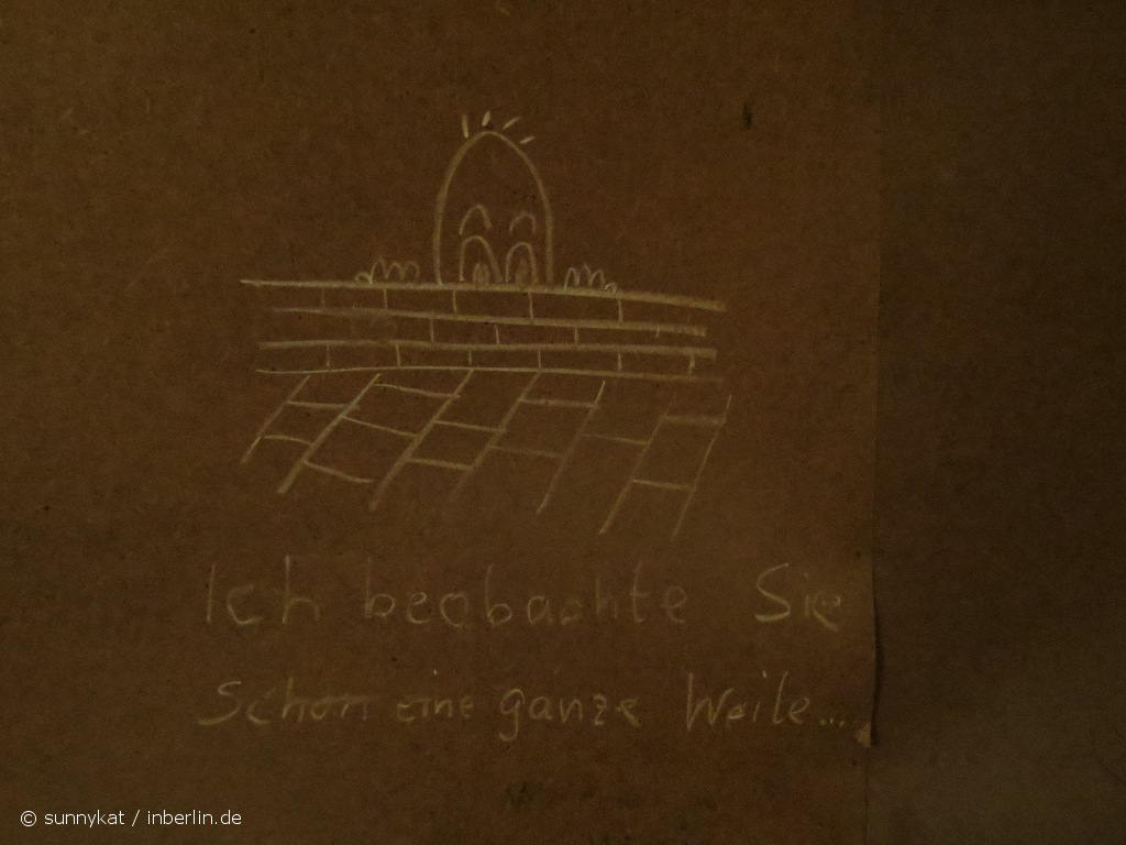 Mich trifft fast der Schlag!Ich bin mir sehr sicher,das ich das kleine Männchen mit dem Spruch,ich beobachte Sie schon eine ganze Weile,gemalt habe.Und zwar im Mai 1983.Zu diesem Zeitpunkt befand ich mich in der UHA Keibelstrasse wegen versuchten ungesetz.Grenzübertritt Paragr.213