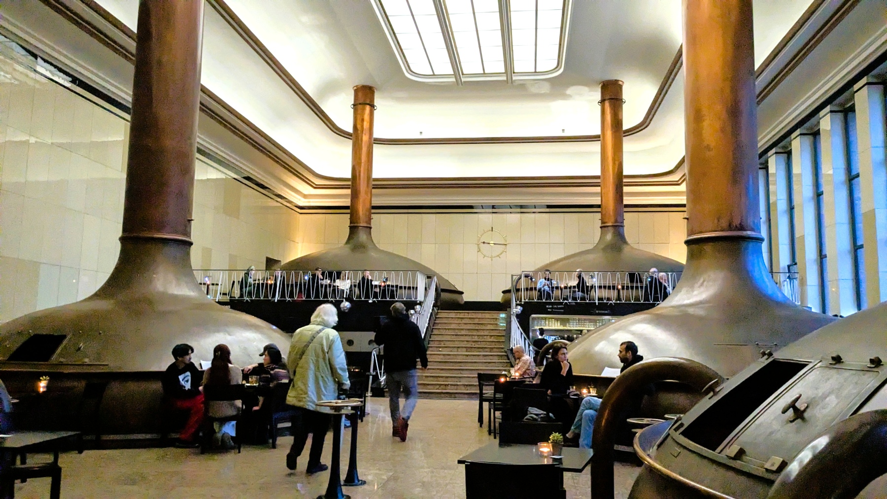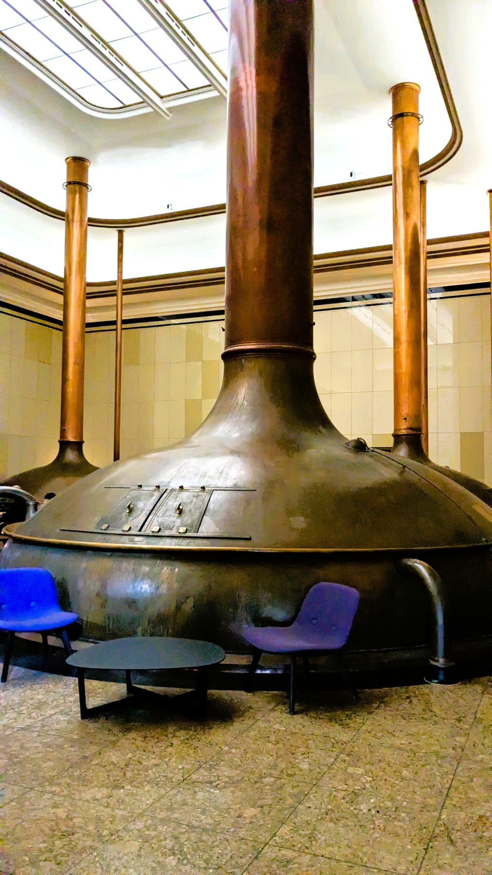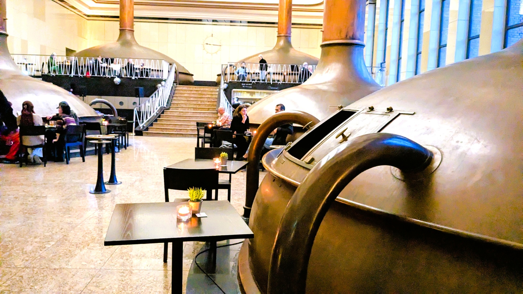 Die riesigen Sudpfannen mit einem Gesamtvolumen von 700 Hektolitern, also 70.000 Litern Bier, erzählen von einer langen Tradition. Bei diesen Dimensionen wirken im riesigen Saal die Besucher an den Tischen des kleinen Cafés winzig. Und beim Blick in die Sudpfannen wird man das Unbehagen nicht los, gleich zwischen Maische und Hopfen im heißen Sud zu versinken.