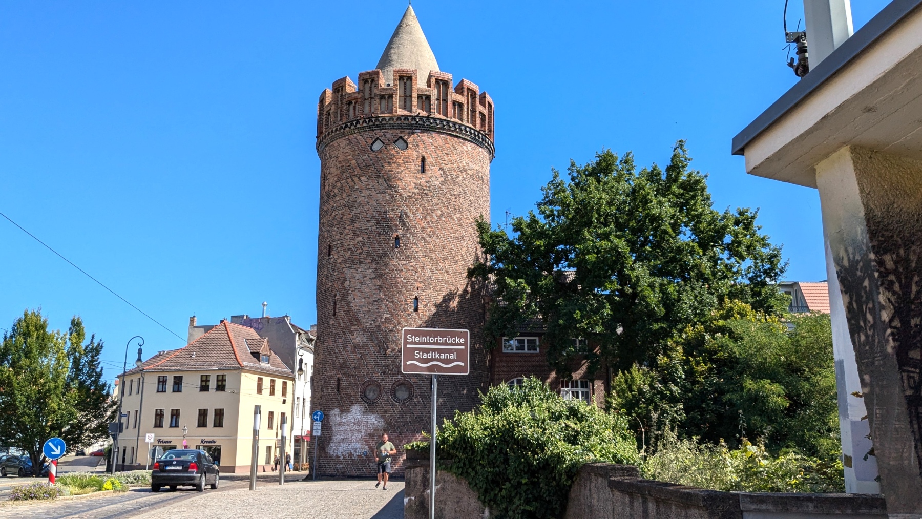 Nur wenige Schritte weiter erhebt sich der Rathenower Torturm, der älteste Stadtturm Brandenburgs.